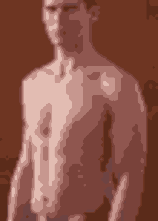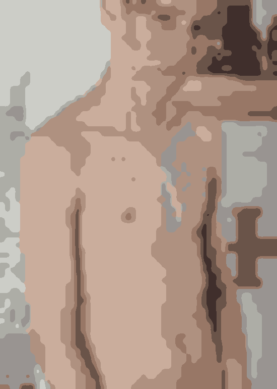 ylävartalo edestä, ei paitaa, lihaksikas, karvattomaksi ajeltu |