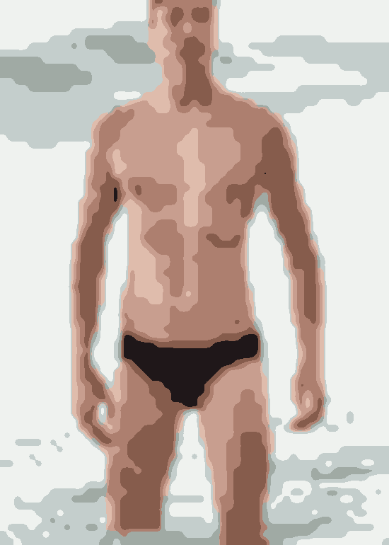 ylävartalo edestä, väljyydeltään melko niukka paita |