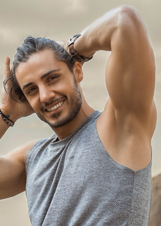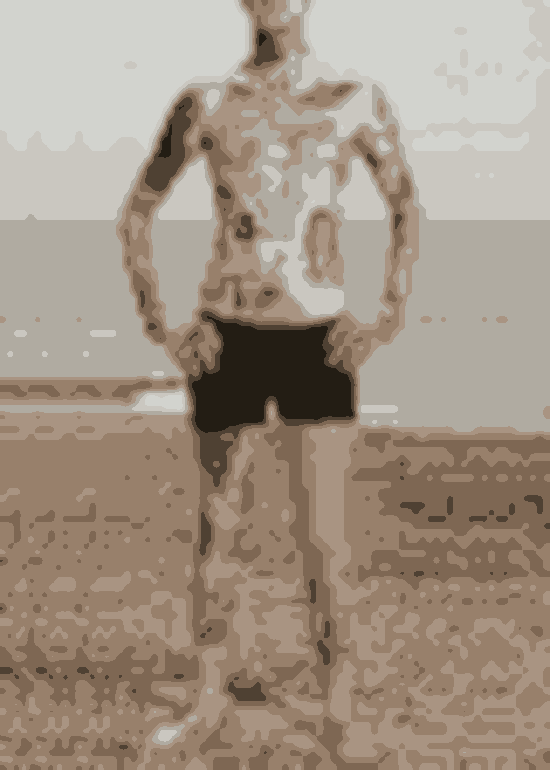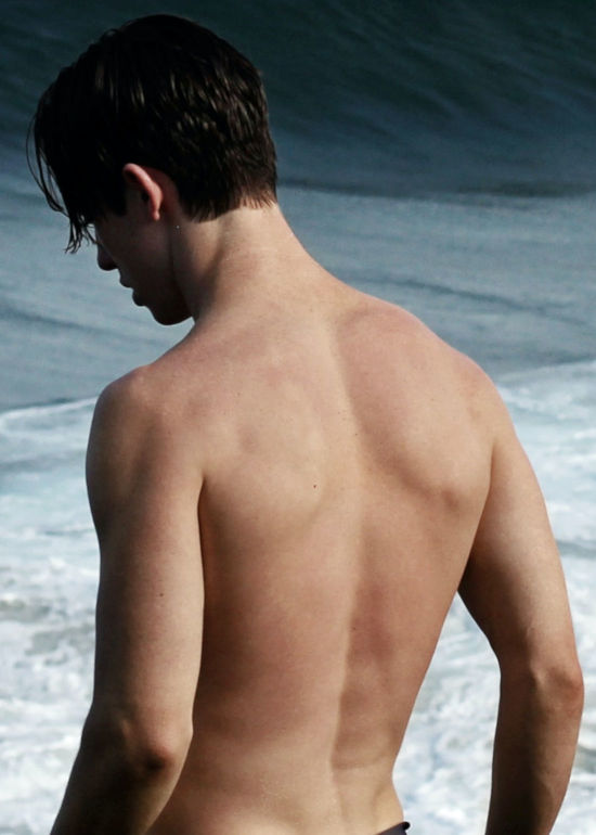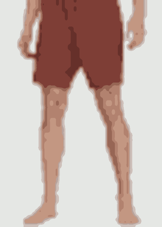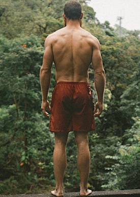 vartalo edestä ja takaa, sporttinen, shortsit, ei paitaa, ei rintakarvoja |