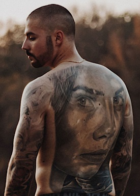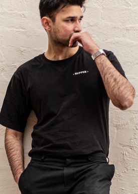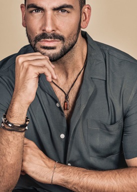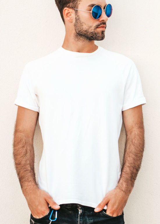 ylävartalo edestä, paidan hiha kyynärpäähän, parta, karvaiset kyynärvarret |