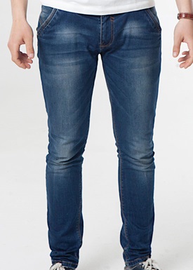 vartalo edestä ja takaa, väljyydeltään hieman niukat farkut ja paita |