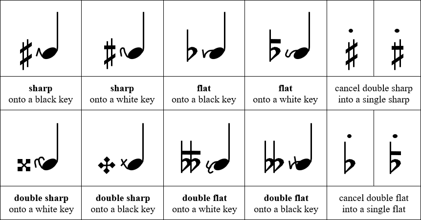 Here is the full list of such “diacritical marks” for various circumstances, together with some modified flat and sharp symbols. Only two of these cases are common in sheet music: flat and sharp onto a black key. All other cases are relatively uncommon.